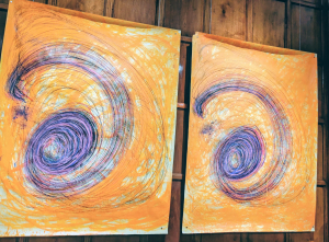 Around the walls of the room were her drawings, reflecting these textile sculptures. They consisted of swirling lines with bright backgrounds.